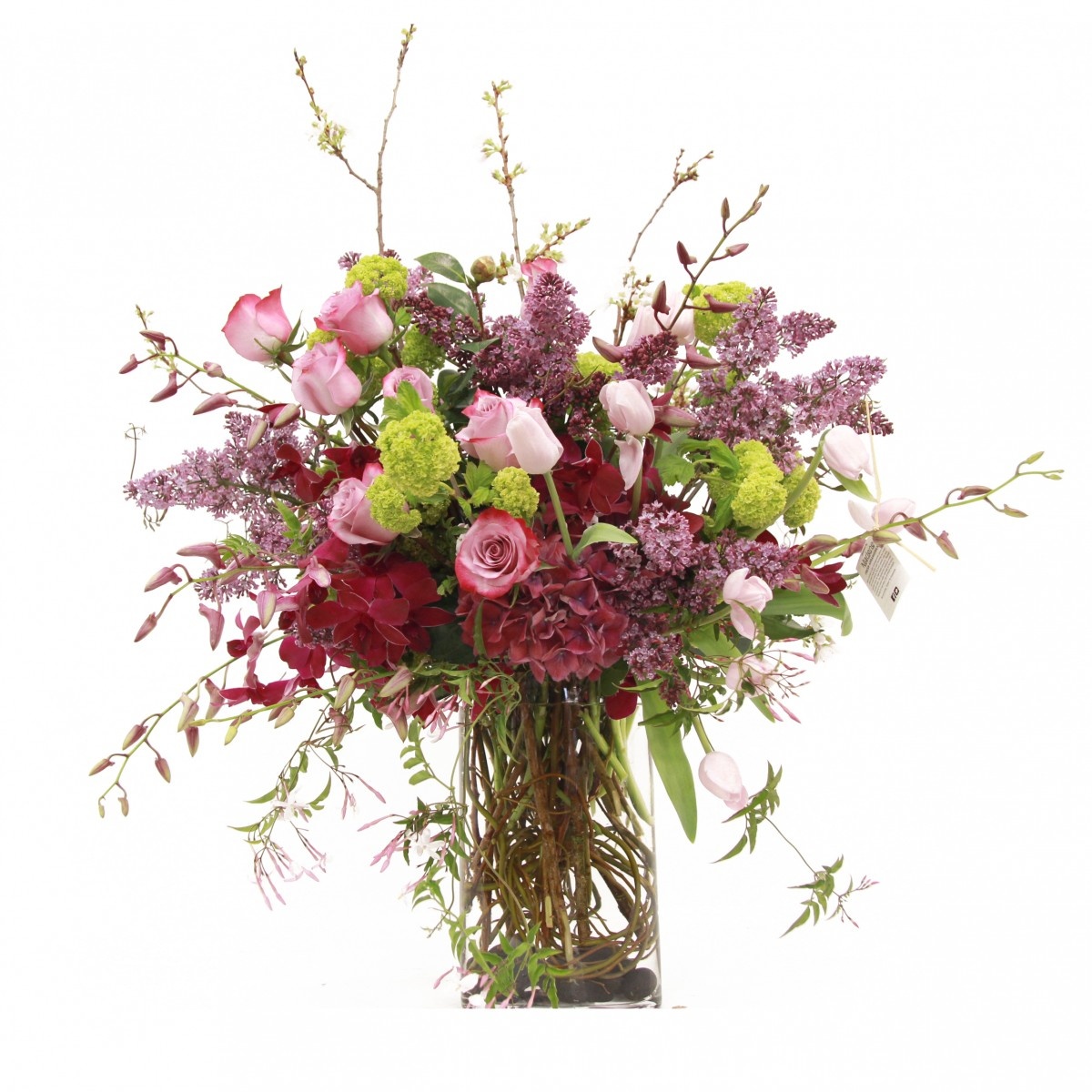 medium tall vase arrangement filled with lavender roses, lilacs, vibernum, flowering branchs, dendrobrium orchids and jasmine vine (all highly seasonal/spring)