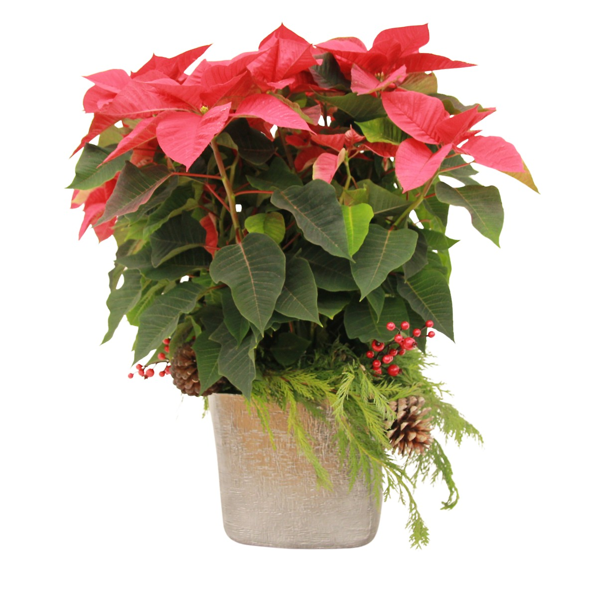 Adorn your space with this classic Poinsettia, a quintessential symbol of the holiday season, featuring vibrant red bracts and deep green foliage. Presented in an elegant pot and enhanced with natural pinecones and festive accents, this plant makes a charming gift or a beautiful addition to any holiday display.